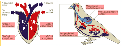 Кровеносная система. В отличие от пресмыкающихся у птиц четырехкамерное сердце. Потоки крови не смешиваются. В левой половине сердца кровь артериальная (насыщенная кислородом). Она поступает ко всем органам и тканям организма по большому кругу кровообращения. В правой половине сердца кровь венозная (насыщенная углекислым газом), она направляется в легкие по малому кругу кровообращения.