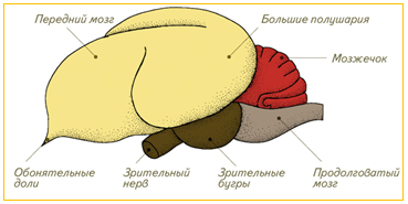 Нервная система. Ее центральный отдел у птиц имеет более сложное строение, чем у рептилии. Особенно хорошо развиты полушария переднего мозга, средний мозг и мозжечок.