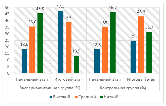 Результаты исследования познавательных универсальных учебных действий демонстрируют (рисунок 1) еще более выраженную положительную динамику в экспериментальной группе. Доля обучающихся с высоким уровнем сформированности познавательных умений возросла на 28,9% и составила 47,5%. В контрольной группе аналогичный прирост составил 6,7%. Систематическая работа с различными источниками информации в ходе реализации проектов способствовала развитию навыков поиска, анализа и преобразования информации.