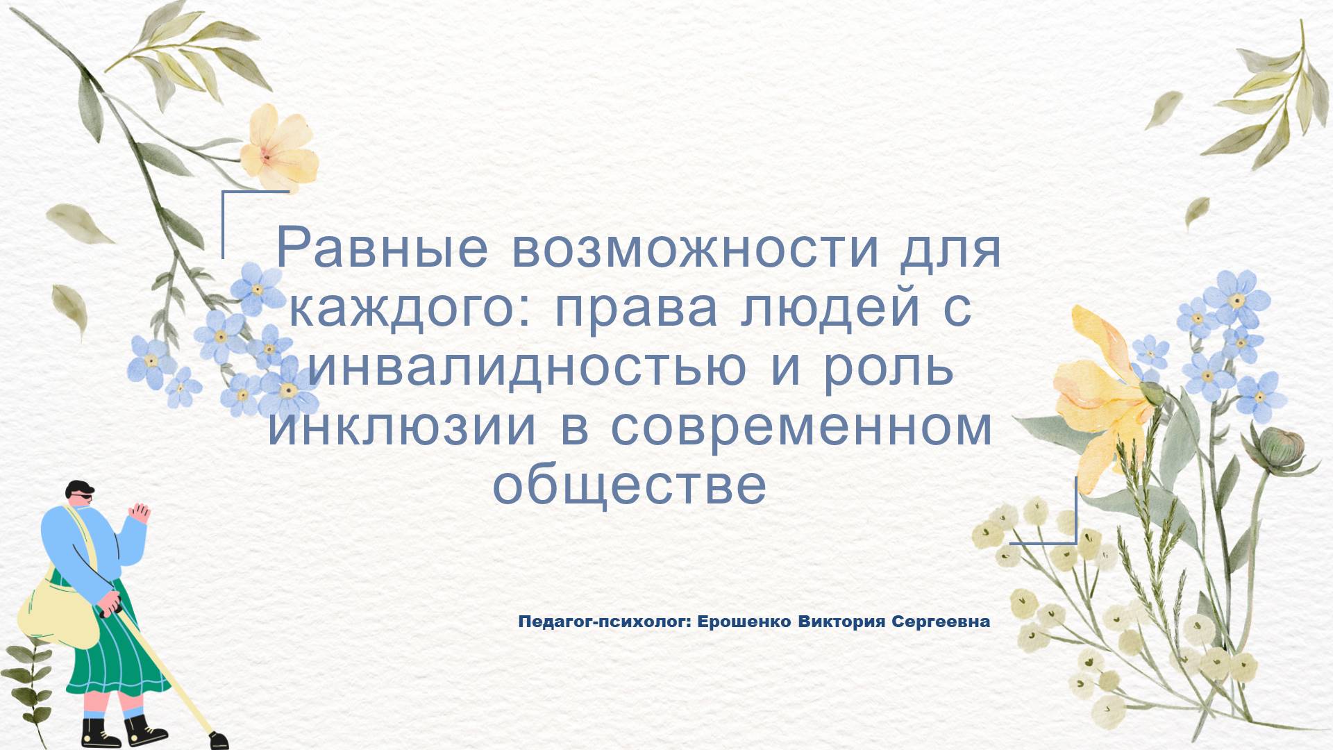 Равные возможности для каждого: права людей с инвалидностью и роль инклюзии в современном обществе Ерошенко Виктория Сергеевна, педагог-психолог Разделы: Работа с дошкольниками, Школьная психологическая служба, Коррекционная педагогика, Инклюзивное образование Ключевые слова: инклюзия Работа выполнена в форме презентации 18.07.2025