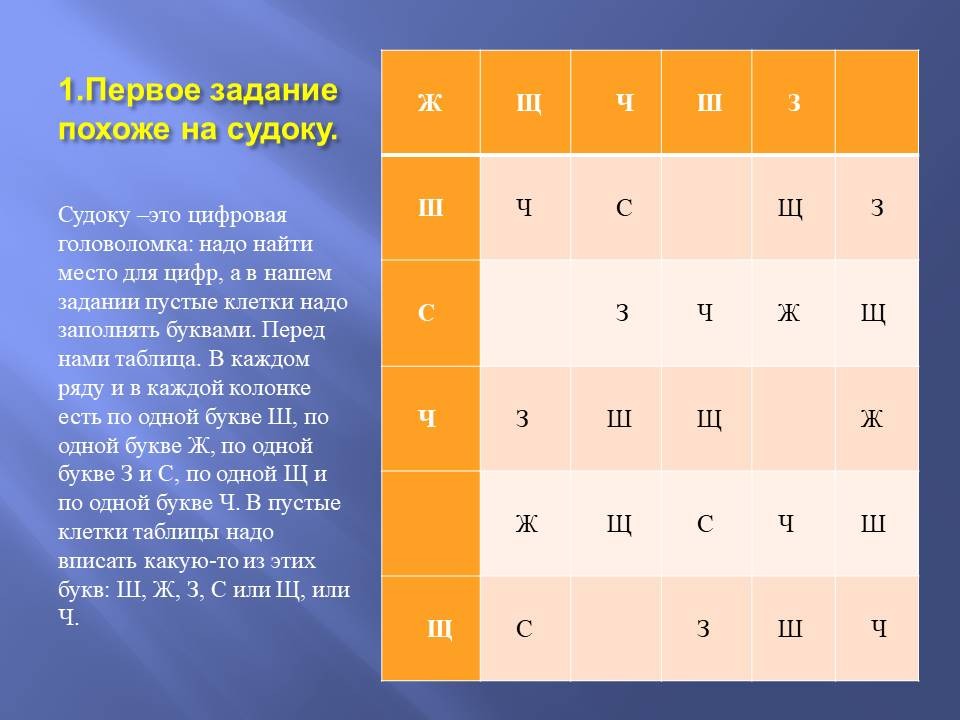 Педагог: Судоку – это цифровая головоломка: надо найти место для цифр, а в нашем задании пустые клетки надо заполнять буквами. Перед нами таблица. В каждом ряду и в каждой колонке есть по одной букве Ш, по одной букве Ж, по одной букве З и С, по одной Щ и по одной букве Ч. В пустые клетки таблицы надо вписать какую-то из этих букв: Ш, Ж, З, С или Щ, или Ч. И в строчку и в столбик каждая буква повторяется только один раз. Ну что попробуем?