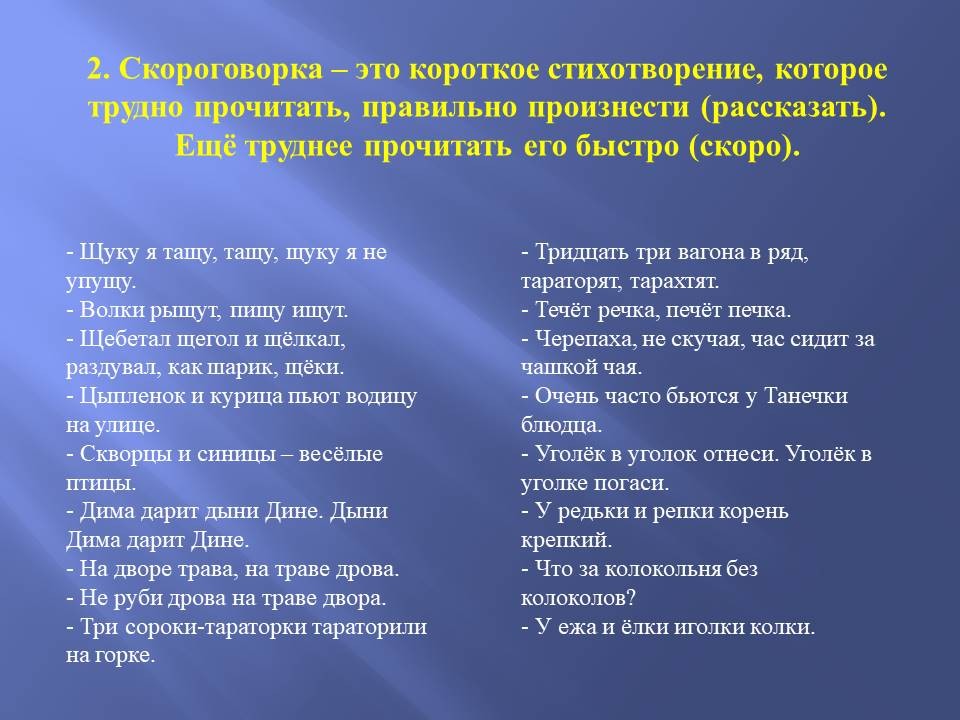 Педагог: Ну конечно, ребята, вы такие догадливые! Скороговорка – это короткое стихотворение, которое трудно прочитать, правильно произнести или рассказать. Ещё труднее прочитать его быстро, скоро. Сегодня мы будем тренироваться. Вытягивайте и читайте.