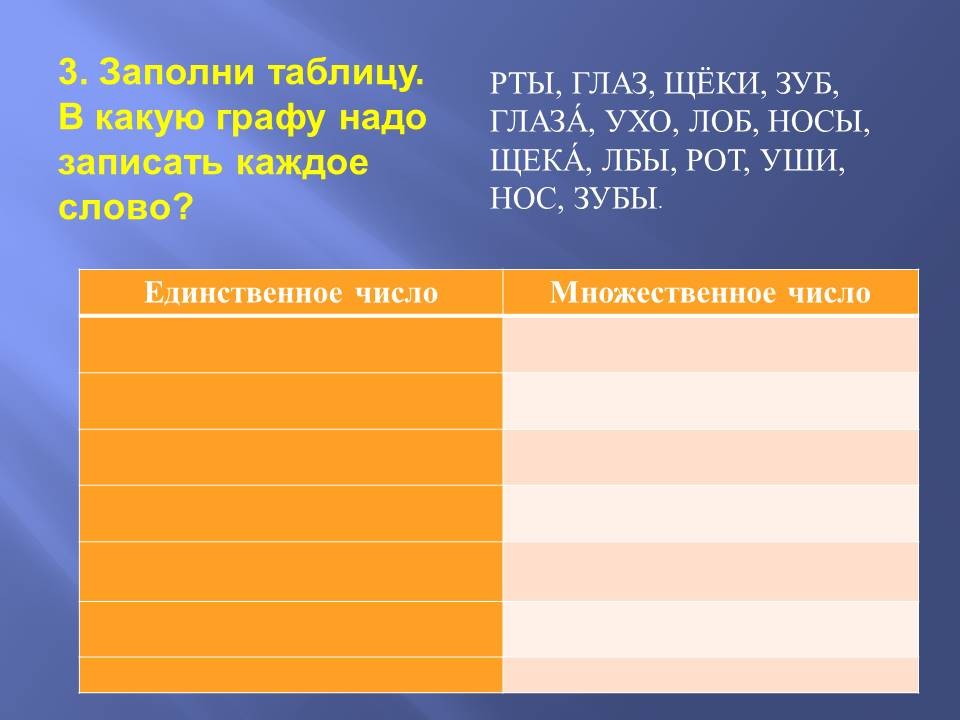 Педагог: Вы все справились! Переходим к следующему заданию. Переворачивайте страницу. Перед вами слова и таблица. Ее надо заполнить. Нужно разделить слова на единственное и множественное число. Посмотрим, как вы справитесь.