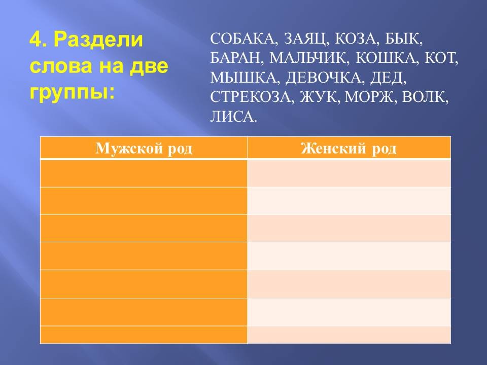Педагог: Следующее задание похоже. Только нужно слова разделить на мужской и женский род. Приступайте.