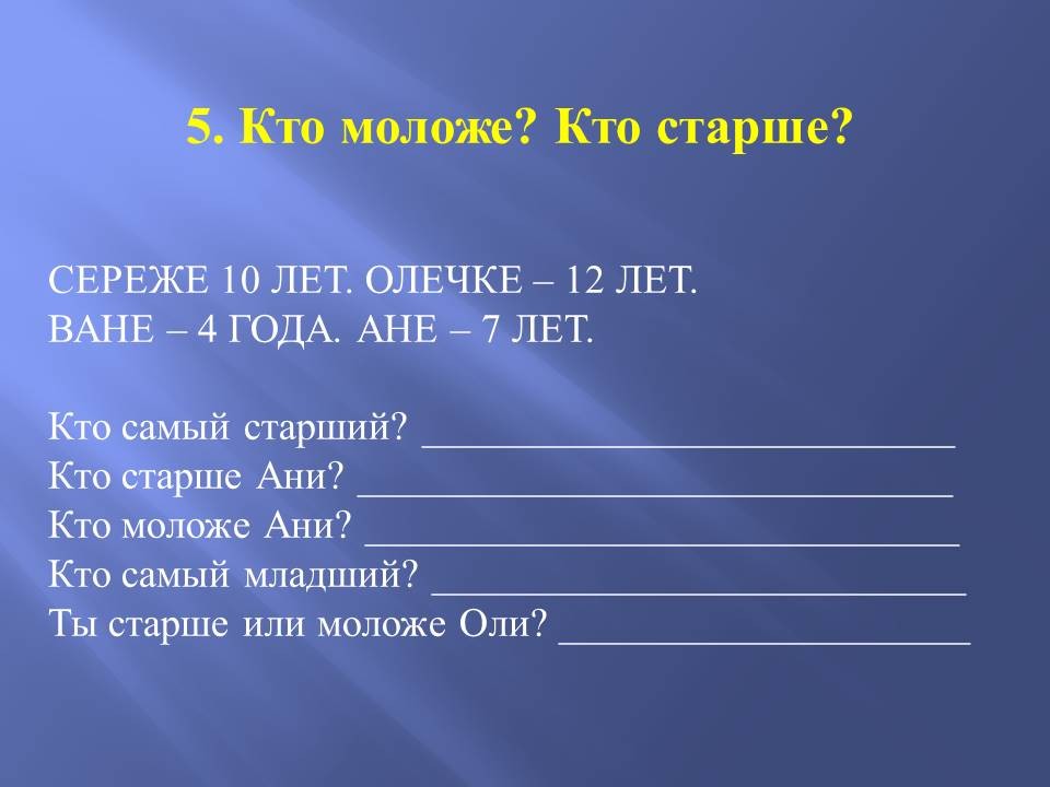 Педагог: И здесь справились. Тогда со следующим заданием вы точно справитесь. Кто моложе? Кто старше?