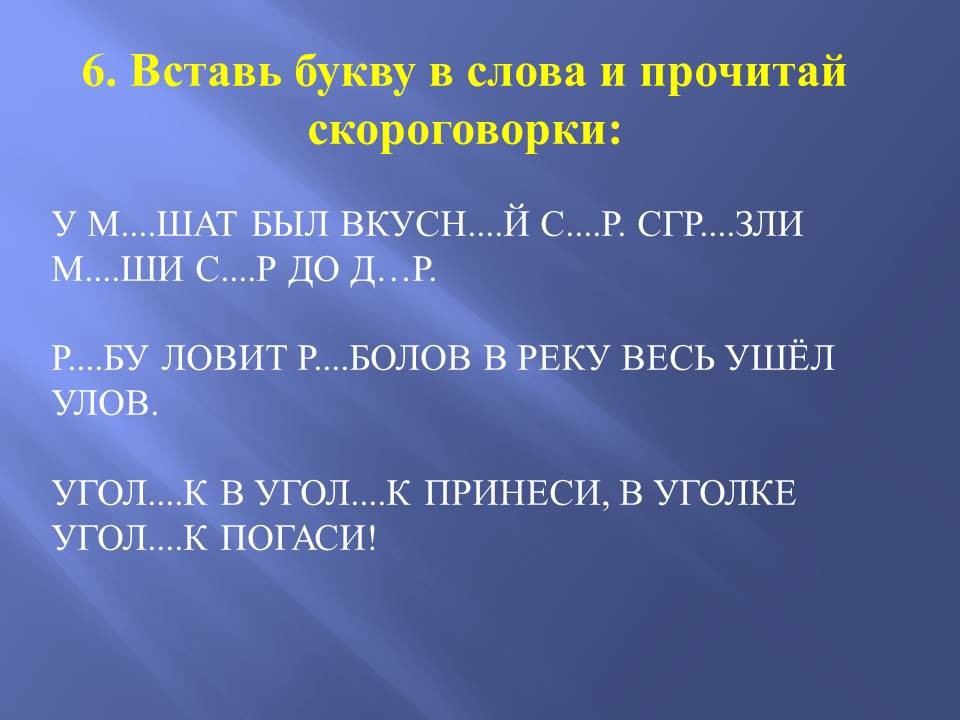 Педагог: Мне, кажется, сегодня я не смогу найти вам занятие, с которым вы не справитесь. Идем дальше. Вставьте букву в слова и прочитай скороговорки: