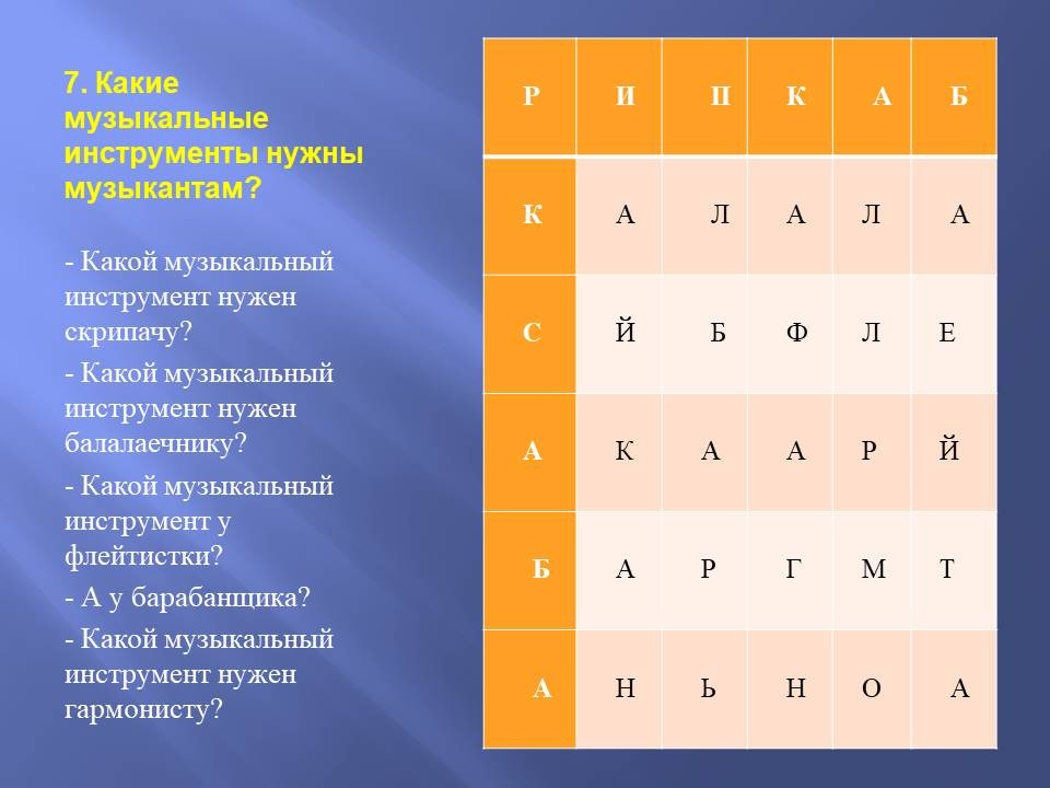 Педагог: Здорово. Вы замечательно работаете с пословицами. Посмотрим, как справляетесь с филвордами. На следующей странице вы увидите вопросы про музыкальные инструменты, а ответы найдете в таблице.