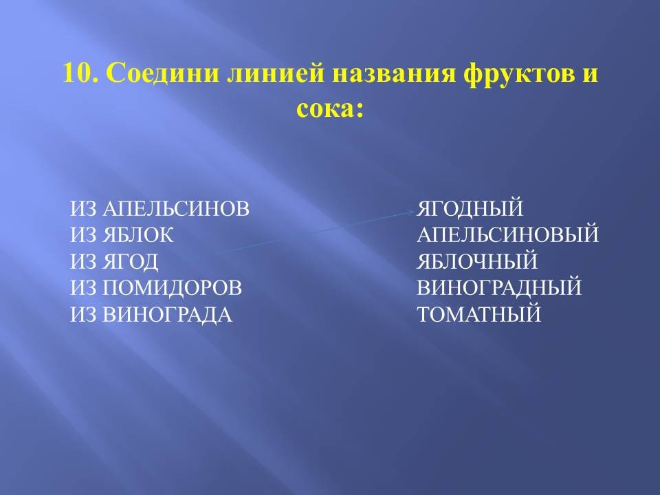Педагог: Вы молодцы. Теперь поработаем с окончаниями. В следующем задание у вас написаны фрукты, нужно определить название сока из этих фруктов и соединить стрелкой.