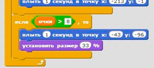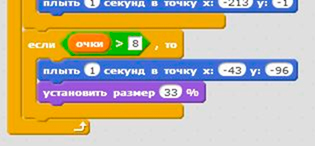 7. Чтобы игрушки заняли свое место, для каждого спрайта (кроме собаки) вставим команду «плыть 1 сек» с появившимися в ней координатами в тело оператора «если «очки» больше». Понятно, что при общем для всех спрайтов условии “если “очки” больше”, все они будут “плыть”, как одно целое.