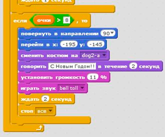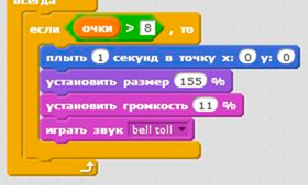 5. При выполнении в каждом спрайте условия «если «очки» больше количества взятых игрушек минус 1» увеличить размеры всех спрайтов и обеспечить их плавное и совместное движение в середину фона. В нашем случае спрайтов 9, поэтому условие “больше 8”.