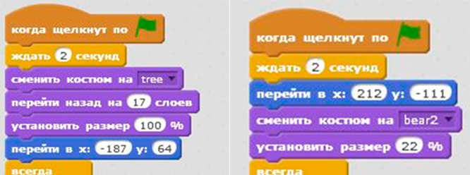 2. Нарисовать или выбрать из библиотеки спрайты – будущие игрушки и саму елку. Важно правильно задать первоначальные небольшие размеры костюмов спрайтов. Поместить елку, например, в левый верхний угол и вставить под флажок команду «поместить» с координатами, которые получила ёлка. Туда же добавить размер. Равномерно разместить по лабиринту игрушки и тоже задать их координаты как начальные (под флажок). Задержка в 2 сек даёт возможность сосредоточится игроку и собаке. Елка слева, игрушки (медведь) справа: