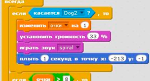 4. Создать переменную «очки» в спрайте собаки, задать ей 0. В каждый спрайт игрушки в условие «если касается собаки» вставить «изменить «очки» на 1» (см. рис 4).