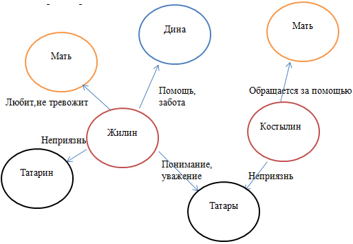 На уроках литературы изучаются художественные тексты, поэтому значимым становится образное и эмоциональное чтение. Читательская грамотность у школьников формируется через опору на текст и внетекстовое знание. В процессе работы с содержательной частью они находят и извлекают нужную информацию, интерпретируют (объясняют и формируют общее понимание прочитанного текста). Такой вид деятельности помогает осмыслить и оценить содержание, а также осмыслить и оценить форму текста. Так, например, после изучения небольших по жанру произведений, применяю технологию продуктивного чтения, где обучающиеся учатся анализировать и понимать прочитанное, а схемы помогают им структурировать содержательную часть и увидеть важные для анализа аспекты. В 5 классе в процессе анализа художественного произведения «Кавказский пленник» Л.Н.Толстого нами была создана схема, на основе которой обучающиеся смогли дать характеристику персонажам, показать с кем у Жилина сложились хорошие отношения, кто идёт с ним на контакт, а кто настроен враждебно.
