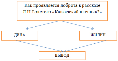 Моделированию ОСК могут предшествовать или вестись параллельно другие виды работ: сочинение, характеристика персонажей, письменный ответ на вопрос. Так, например, после изучения произведения «Кавказский пленник» (5 класс) для написания сочинения - рассуждения ребятам была дана тема в виде риторического вопроса: «Как проявляется доброта в рассказе Л.Н.Толстого «Кавказский пленник»? Чтобы обучающиеся справились с новой формой работы, совместно был составлен план, зарисована веерная схема.