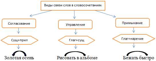 Опорные схемы-конспекты представлены во многих печатных сборниках, и они разные по сложности наполнения. Я считаю, что каждый учитель должен для себя выбрать свои схемы, которые понятны обучающимся и помогают в отработке грамотного письма. Так, при изучении темы в 8 классе «Виды связи слов в словосочетаниях», после прочтения теоретической части вместе со мной ребята зарисовывают схему и приводят примеры на каждый вид связи.
