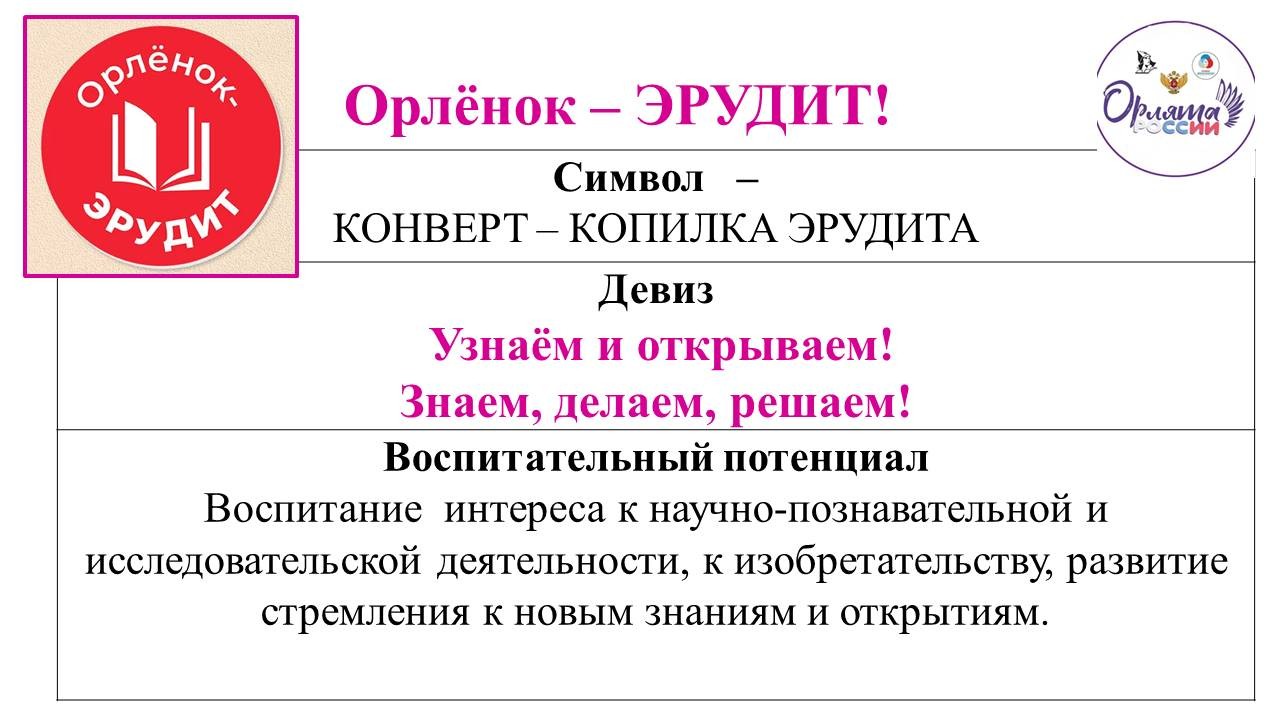 2. По Треку «Орлёнок – Эрудит», символом которого является КОНВЕРТ-КОПИЛКА, под девизом «Узнаём и открываем! Знаем, делаем, решаем!», воспитывается интерес к научно-познавательной и исследовательской деятельности, к изобретательству, развитие стремления к новым знаниям и открытиям, что приводят наших учеников к Призовым и Победным местам на различных этапах Научно-практических конференций.