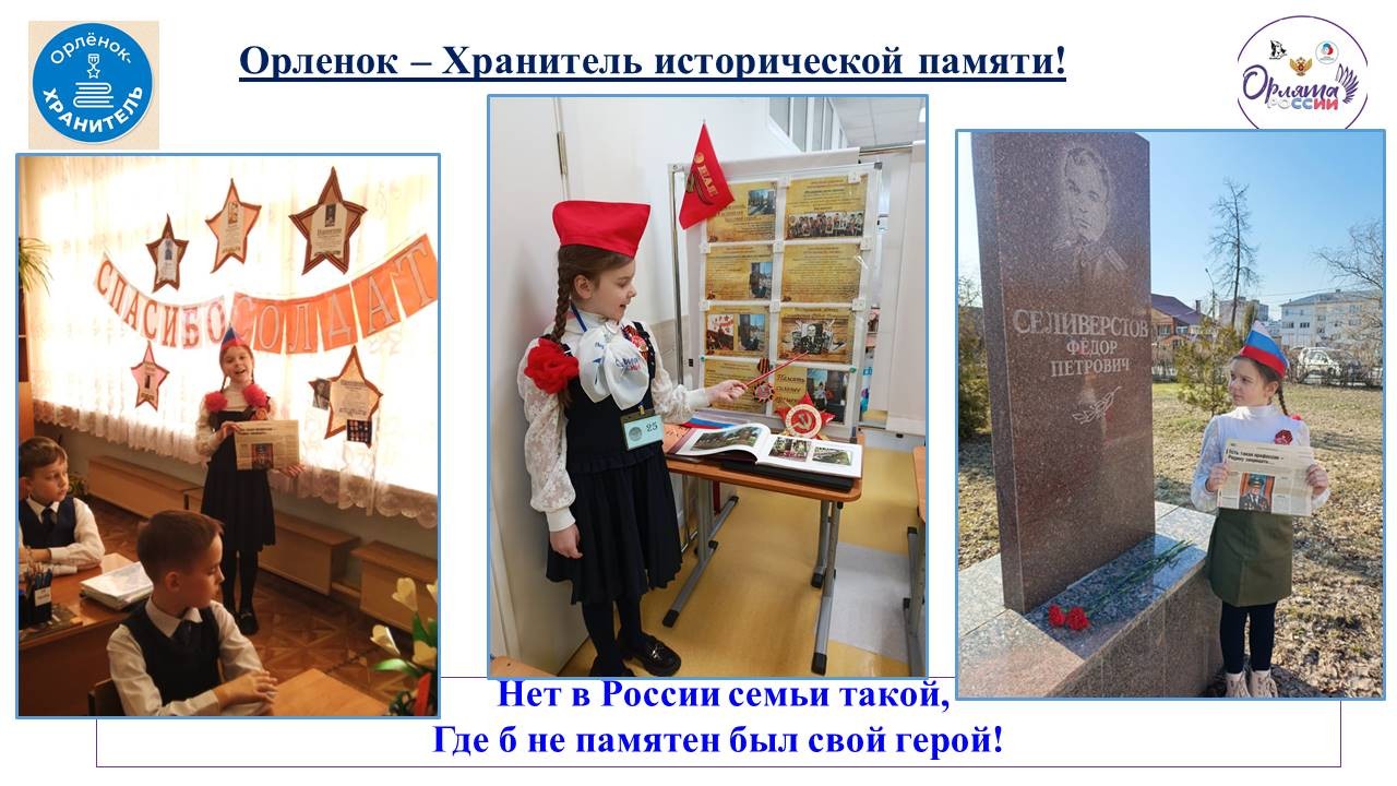 Ученица Екатерина А. на региональном конкурсе исследовательских работ 29 марта 2025 года защищала Проект «Нет в России семьи такой, где б не памятен был свой герой». Катя рассказала о родном человеке Селивёрстове Фёдоре Петровиче – Герое Советского Союза. 23 февраля 1945 года за 157 боевых вылетов на разведку, фотографирование оборонительных рубежей и штурмовку противника Фёдору Петровичу присвоено звание Героя. Екатерина стала Лауреатом НПК.