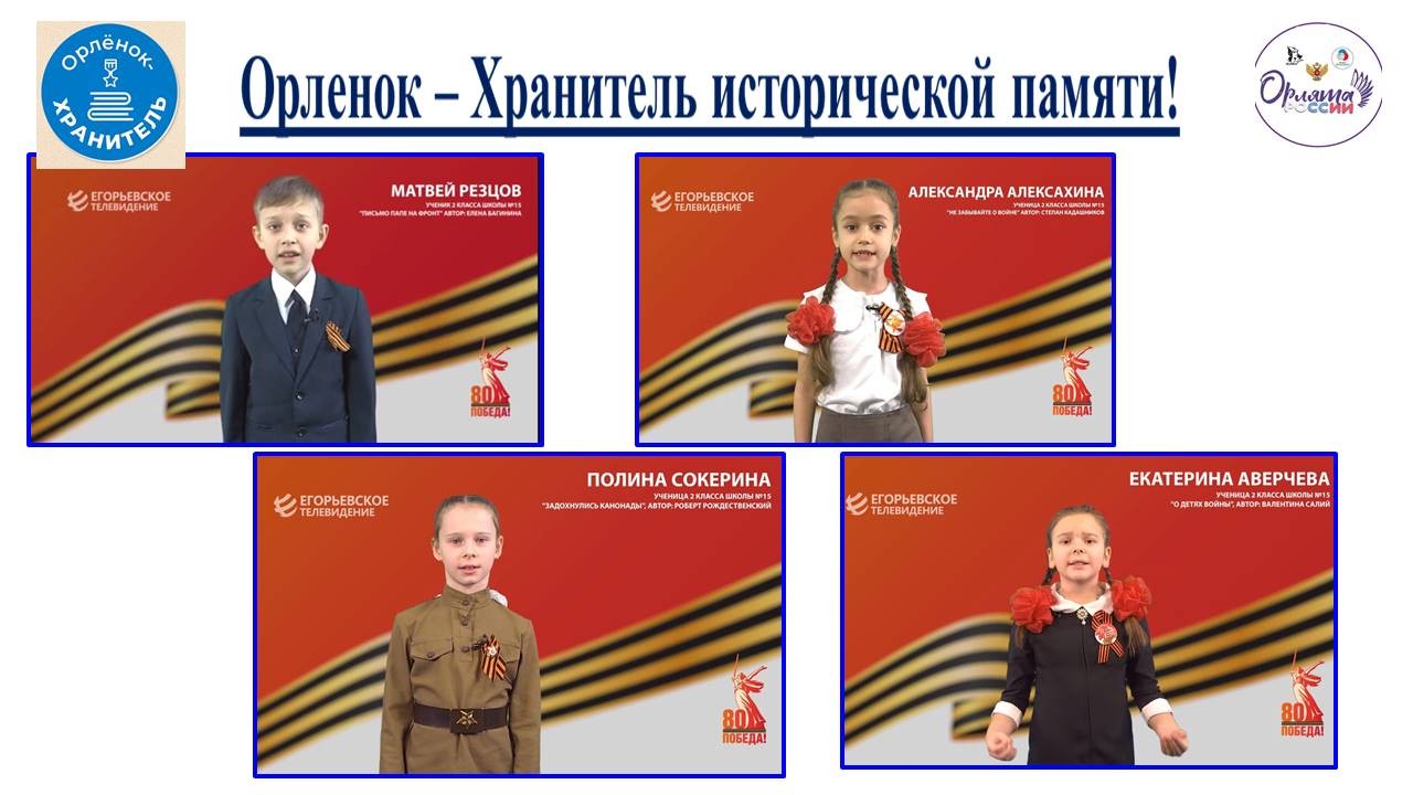 - 3 апреля 2025 года в день памяти (прошло 40 лет со дня гибели) Ларюшина Евгения Ивановича – Героя Советского Союза – активисты-орлята побывали у здания школы 5, в которой учился Летчик-испытатель. Ларюшин погиб при выполнении испытательного полёта на вертолёте В-80 (прототип вертолёта К-50 «Чёрная акула», бортовой номер 1). Именем Ларюшина назван бульвар в Егорьевске, а на здании пятой школы установлена мемориальная доска.