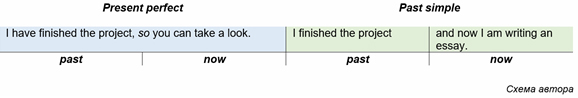 В первом случае использовано The present perfect tense в первой части предложения, поскольку говорящий предлагает взглянуть на проект потому, что он его закончил. Возможность на данный момент посмотреть проект является результатом того, что проект завершен: прежнее законченное действие связано с настоящим. Из примера выше с игрой в теннис мы знаем, что The present perfect tense стоит одной ногой в прошлом, а другой в настоящем. Мы его так и называем present (настоящее) + perfect (совершенное).