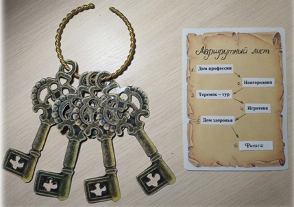 Ребятам старшего дошкольного возраста со своим воспитателем предлагается отправиться в путешествие, в конце которого им необходимо открыть загаданное слово по теме профессии. Группе выдаётся маршрутный лист, в котором указана очерёдность посещения центров. В каждом центре ребята получают задания, за выполнение которых им выдаётся ключ. Задания для центров педагог готовит заранее. Каждый ключ даёт право открыть одну букву в загаданном слове.