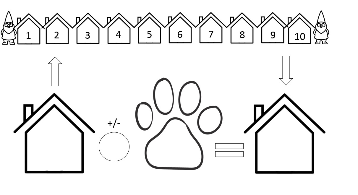 Наверху представлены числа от 1 до 10 в домиках. Это адаптированная линейка. Слева и справа от нее нарисованы гномики. Если ребенок не понимает направление движения по шкале при сложении и вычитании, то на гномиках проставляются знаки «+» и «-».