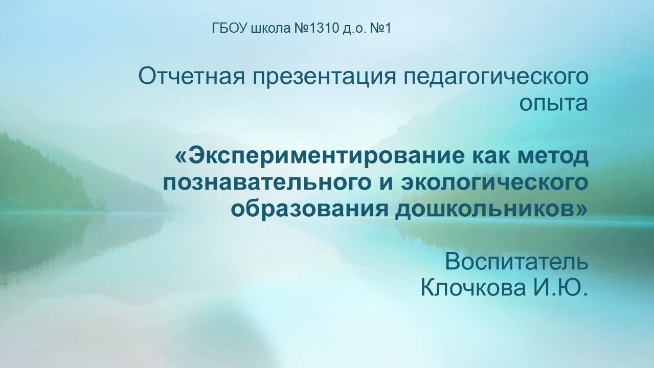 Экспериментирование как метод познавательного и экологического образования дошкольника Клочкова Ирина Юрьевна, воспитатель Разделы: Работа с дошкольниками, Экология Ключевые слова: экспериментальная деятельность Работа выполнена в форме презентации 10.09.2025