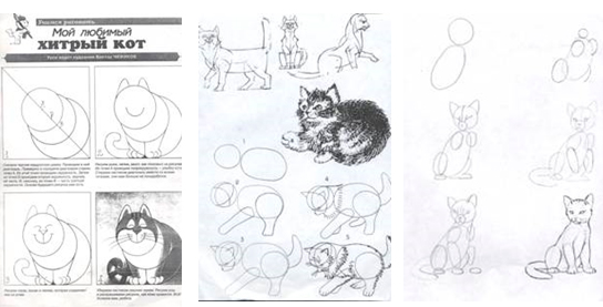 На доске можно разобрать приемы рисования кошки или использовать раздаточный материал со схемами – «Как нарисовать кошку».