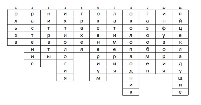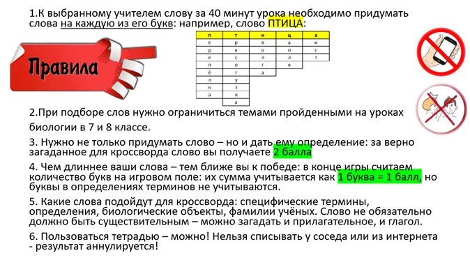 В основу используемой нами игры была взята разработка из книги «Русский язык в играх» под названием «Расчёска (гребёнка)» и «Конкурс кроссвордов» [2-4]. Наша модифицированная под нужды биологии игра позволяет школьникам потренироваться в составлении заданий для кроссворда-гребёнки, при этом слова могут относиться только к определённым темам – то есть являться терминами и определениями в рамках осваиваемого раздела биологии. Ребятам правила игры объясняются с помощью информационного листа или выносятся на слайд презентации (см. приложение 1).