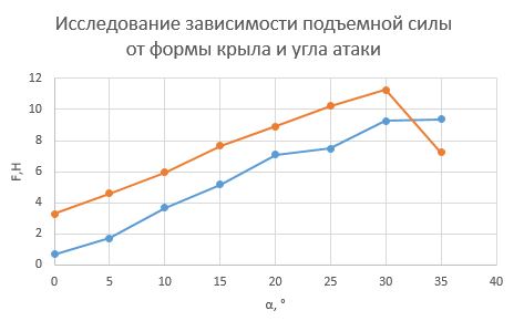 Далее в табличном процессоре строим графики зависимости подъемной силы от угла атаки для каждого типа крыла (синий график – для симметричного крыла, оранжевый – для несимметричного).