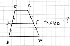 - Можно ли рассчитать площадь этой трапеции, пользуясь тем правилом, которое мы сформулировали вчера? (нет, так как не можем вычислить точно основания, но можем подсчитать длину отрезка МF, который является средней линией и вычислить площадь этого четырехугольника умножив среднюю линию на высоту).