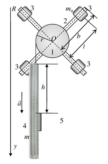 Предлагаемая установка (маятник Обербека) представляет собой шкив, радиусом r с закрепленными в нем четырьмя перпендикулярными друг другу стержнями (2) длины bс нанесенными на них рисками (в нашем случае мы изготовили шкив, распечатанный на 3D принтере со стержнями-болтами М10, вставленными в отверстия). На каждом стержне накручены дополнительные грузы 3 (гайки М10), имеющие массу, которые можно перемещать вдоль стержня. Это позволяет пошагово изменять момент инерции маятника. Нить с основным грузом массой m на конце накручивается на шкив. Шкив имеет возможность свободно вращаться вокруг горизонтальной оси. При вращении шкива нить раскручивается и основной груз движется поступательно вниз. Время движения груза t между пуском и падением фиксируется секундомером, пройденное расстояние h измеряется рулеткой.