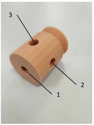 1. Основная часть маятника Обербека представляет собой двухуровневый шкив с тремя сквозными отверстиями (1, 2 и 3). Шкив отпечатан на 3D принтере по заранее смоделированному чертежу в любой доступной открытой онлайн платформе.