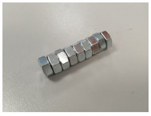 5. Дожидаемся пока клей засохнет, прикрепляем нитку (отрез длиной 1-1,5 м) к грузу, закрепив конец нити между гайками посередине.