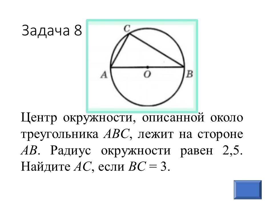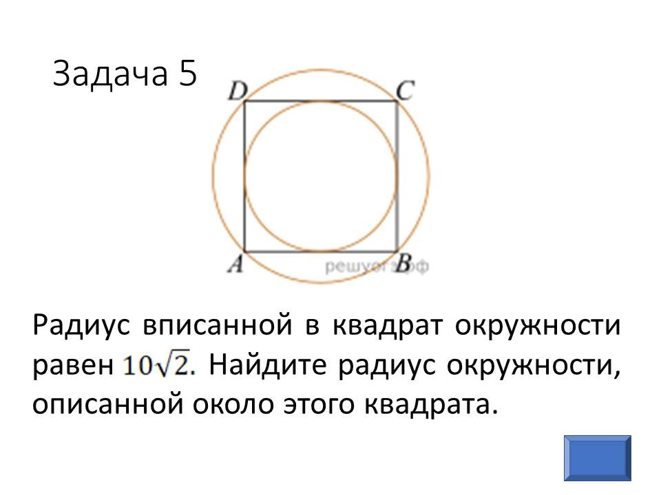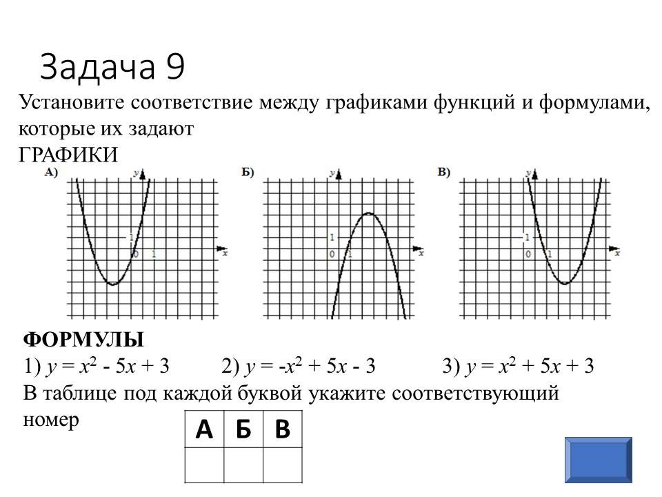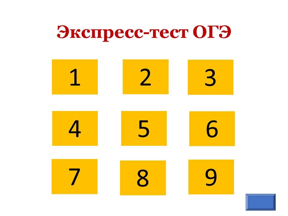 - А сейчас мы проведем экспресс-тест ОГЭ, чтобы быстро определить, какие задачи из рассмотренных сегодня на уроке вы научились решать, а какие еще требуют дополнительной проработки. Перед вами на слайде 9 цифр – это номера задач, которые сейчас вам нужно решить, ответы на них вы записываете в бланк у вас на столе. |