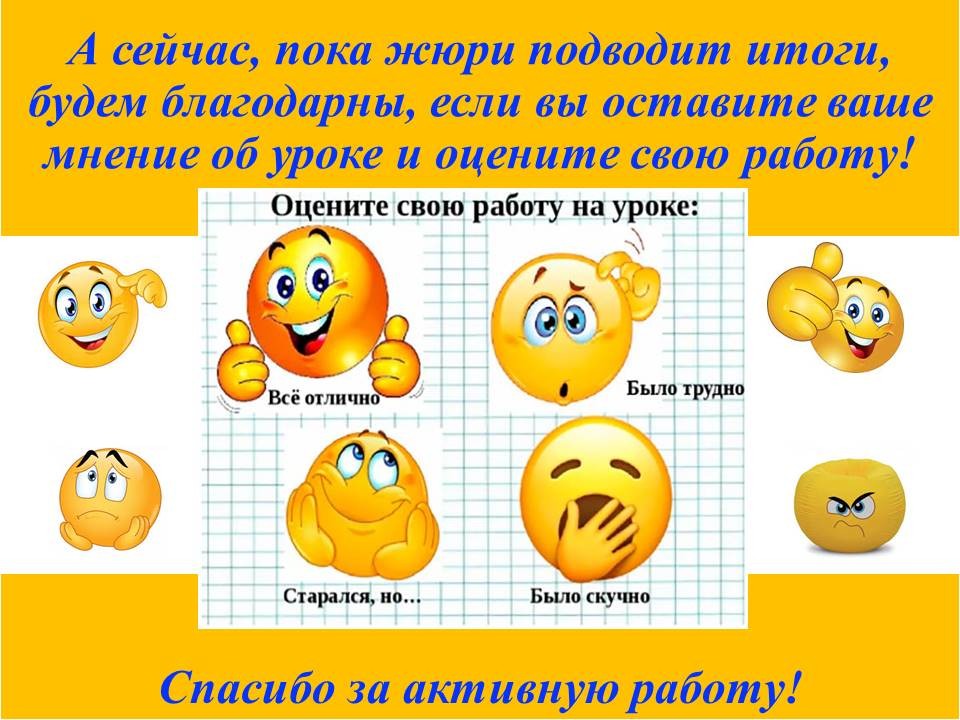 - Пока жюри подсчитывает результаты и подводит итоги, просим вас выразить свое мнение об этом уроке, о своей работе на уроке и о работе наших старших ребят, выступавших сегодня для вас. В карточках у вас на столе закончите предложения и обведите один из смайликов. |