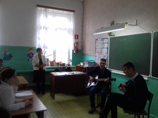 Звучит песня «Шестая рота» (Памяти бойцов 6 роты 104 полка 76-й дивизии – Стас Конопляников) в исполнении обучающихся 11 класса Пазухина А. и Кулькина В., аккомпанемент – гитара.