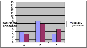 В эксперименте участвовали 15 человек одной из одного класса. При обработке результатов методики на узнавание лексических единиц выяснилось, что 4 человека имеют высокий уровень сформированности лексических единиц, 8 человек средний уровень сформированности лексических единиц, 3 человека низкий уровень сформированности лексических единиц.