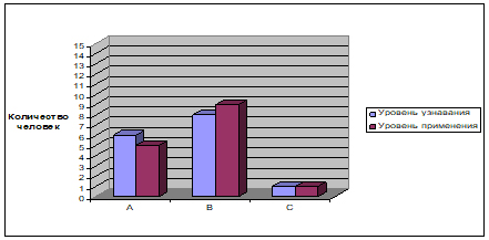 При обработки результатов методики на узнавание лексических единиц выяснилось, что 6 человек имеют высокий уровень сформированности лексических навыков, 8 человек уровень сформированности лексических навыков, 1 человек низкий уровень сформированности лексических навыков.