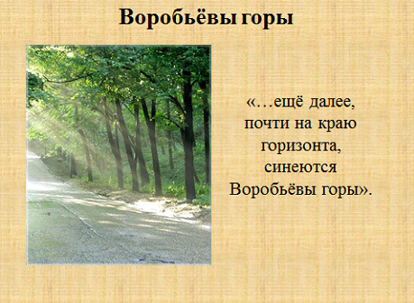 Воробьёвы горы: «… ещё далее, почти на краю горизонта, синеются Воробьёвы горы». (Слайд 11)