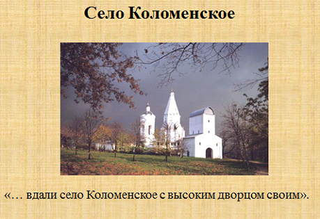 Село Коломенское: «…вдали село Коломенское с высоким дворцом своим». (Слайд 12)
