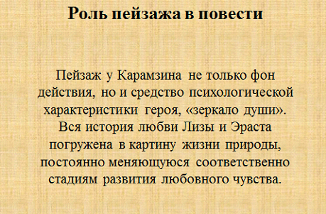 История любви Лизы и Эраста погружена в картину жизни природы, постоянно меняющуюся и соответствующую стадиям развития любви героев. Примеры эмоциональной наполненности пейзажа: осенний пейзаж вступления, предвещающий трагическую развязку, картина ясного майского утра, которым происходит объяснение в любви Лизы и Эраста, картина страшной грозы, сопровождающая начало трагического перелома в судьбе героини.