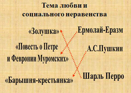 Назовите известные произведения, в которых авторы затрагивают тему «Любовь и социальное неравенство». («Золушка», «Повесть о Петре и Февронии Муромских», «Барышня-крестьянка») Найдите соответствия между авторами и названиями произведений. (Слайд 15)