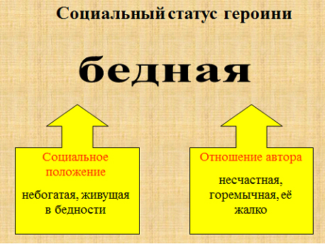 - Это слово указывает на социальное положение героини и на отношение к ней автора. (Слайд 16)