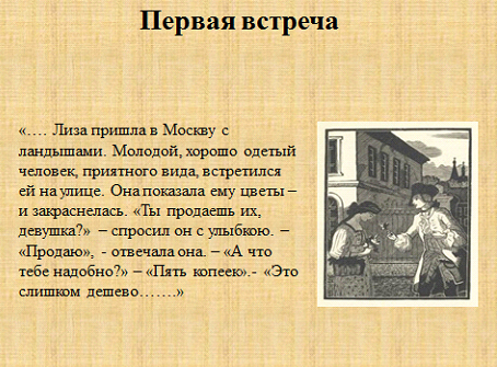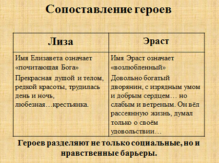 А какое мнение сложилось у вас об Эрасте? Характеру крестьянки противопоставлен характер доброго, избалованного барина, не способного думать о последствиях своих поступков, Лиза привлекла его своей внешностью. Намерение обольстить девушку не входило в его планы: «Ему казалось, что он нашел в Лизе то, что сердце давно искало». Первоначально он думал «о чистых радостях», намеревался «жить с Лизой, как брат с сестрою». Эраст изображен Карамзиным не вероломным обманщиком-соблазнителем («довольно богатый дворянин» с «добрым от природы» сердцем, но «слабым и ветреным, он вел рассеянную жизнь, думал только о своем удовольствии...»).