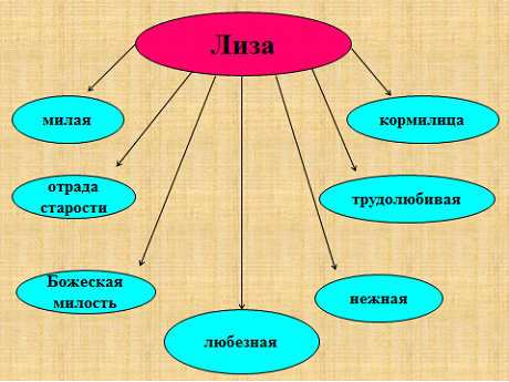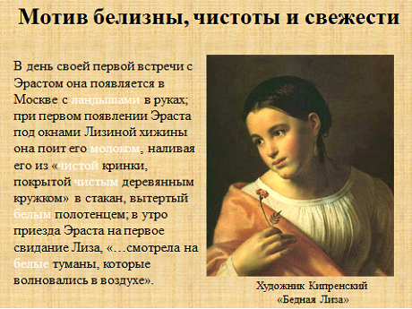 Образу Лизы сопутствует мотив белизны, чистоты и свежести: в день своей первой встречи с Эрастом она появляется в Москве с ландышами в руках; при первом появлении Эраста под окнами Лизиной хижины она поит его молоком, наливая его из «чистой кринки, покрытой чистым деревянным кружком» в стакан, вытертый белым полотенцем; в утро приезда Эраста на первое свидание Лиза, «подгорюнившись, смотрела на белые туманы, которые волновались в воздухе».