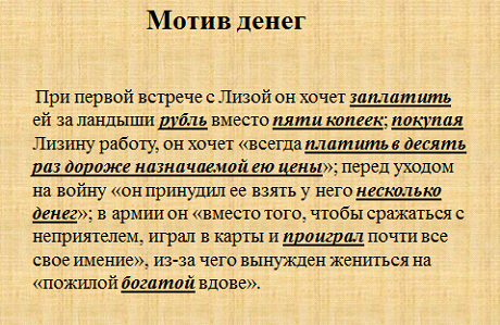 Эраст измеряет всё деньгами. Деньги – символ неискренних отношений. Лейтмотив денег сопутствует образу дворянина Эраста, а не бедной Лизы. У героини нет никаких корыстных помыслов.