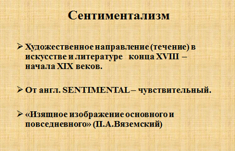 Сентиментализм – это художественное направление в искусстве и литературе конца XVIII – начала XIX вв. Понятие «сентиментализм» (от англ. sentimental – чувствительный) указывает на то, что чувство – центральная эстетическая категория этого направления.