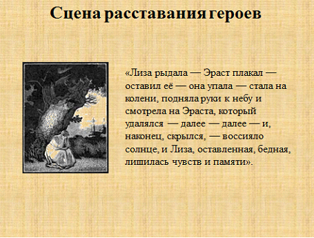«Лиза рыдала – Эраст плакал – оставил её – она упала – стала на колени, подняла руки к небу и смотрела на Эраста, который удалялся – далее – далее – и, наконец, скрылся, – воссияло солнце, и Лиза, оставленная, бедная, лишилась чувств и памяти».