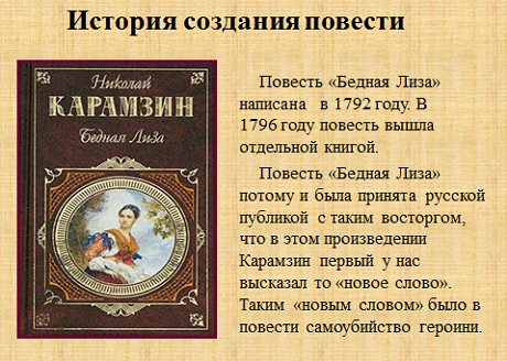 Повесть «Бедная Лиза» была напечатана в «Московском журнале» в 1792 г., принесла автору известность и популярность, переиздавалась шесть раз. Волна подражаний захлестнула русскую литературу на рубеже XVIII—XIX вв.: появляются произведения, повторяющие карамзинский сюжет («Даша, деревенская девушка» П.Львова, «Бедная Маша» А.Измайлова, «История бедной Марьи» Н.Брусилова, «Обольщенная Генриетта» И.Свечинского, «Прекрасная Татьяна» В.Измайлова).