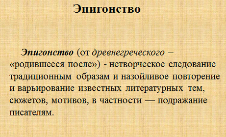 Это явление в литературоведении называется эпигонством (от др. греч. – родившееся после) – нетворческое следование традиционным образам и назойливое повторение и варьирование известных литературных тем, сюжетов, мотивов, в частности – подражание писателям. (Слайд 6)